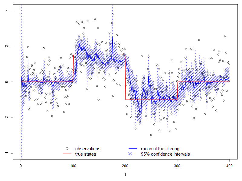 x_mean <- apply(x, 2, mean) x_quantiles <- apply(x, 2, function(x) quantile(x, probs = c(0.025, 0.975))) par(cex = 1, cex.lab = 1, cex.axis = 1, cex.main = 1, mar = c(5, 3, 1, 1)) plot(y, xlab = "t", ylab = "", ylim = c(-4, 4)) lines(x_mean, col = "blue", lwd = 2) polygon(c(1:T, T:1), c(x_quantiles[1, ], rev(x_quantiles[2, ])), density=20, col="blue", border=NA) lines(t, col = "red", lwd = 2) legend("bottom", c("observations", "true states", "mean of the filtering", "95% confidence intervals"), ncol = 2, bty = "n", inset = 0.00, cex = 1.25, lty = c(NA, 1, 1, NA), lwd = c(1, 2, 2, NA), pch = c(21, NA, NA, NA), fill = c(NA, NA, NA, "blue"), density = c(0, 0, 0, 20), border = NA, col = c("black", "red", "blue", "blue"))